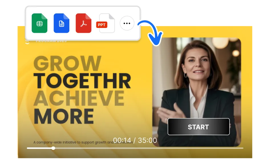 قم بتحميل البرنامج النصي أو الشرائح التدريبية الخاصة بك، واختر الصورة الرمزية والصوت بالذكاء الاصطناعي، ثم أضف عناصر تفاعلية مثل الأزرار والمسارات المتفرعة والاختبارات وروابط عناوين URL - كل ذلك في منصة واحدة.