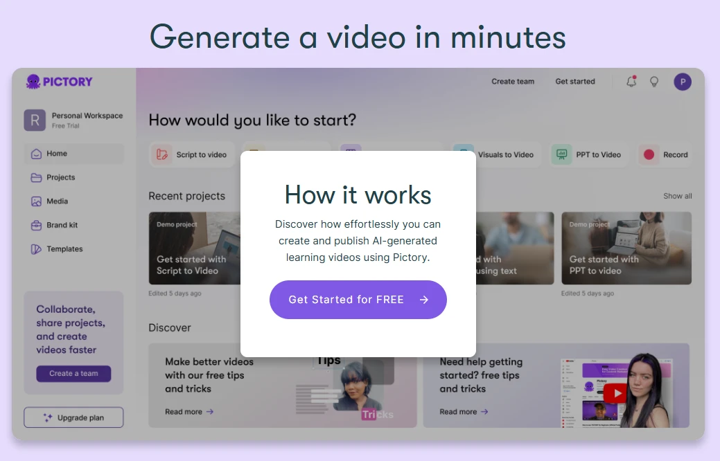 Pictory transforms blogs, webinars, or scripts into short, shareable videos — perfect for repurposing content.