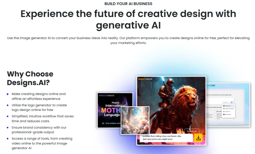 Designs.ai is a versatile platform for AI-generated design and video creation.