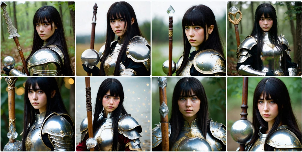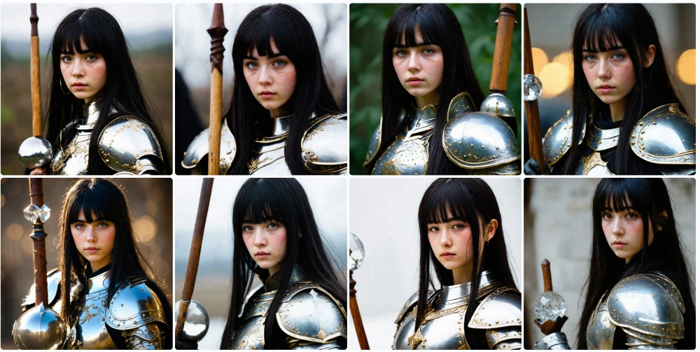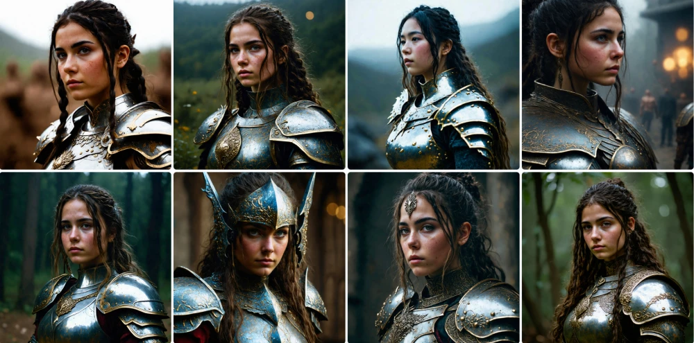 Qui, l'acconciatura, il colore dei capelli, il colore degli occhi, i dettagli dell'armatura e l'espressione sono tutti chiaramente specificati. Copiando e incollando un prompt così strutturato per le scene successive si otterranno probabilmente risultati dall'aspetto simile, con variazioni principalmente nello sfondo o nella posa.