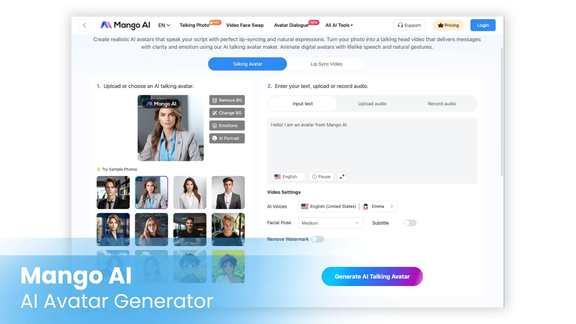 Mango AI is an online AI video platform that turns text, images, and scripts into talking avatar videos. As an AI avatar maker, it allows users to upload portrait photos or short clips, then generate video content where those avatars speak with natural lip sync, expressions, and voice. It also includes features such as face swap, avatar customization, and template-based video generation for business, educational, or social content.