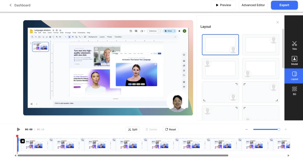 네.사용 AI 스튜디오 웹캠을 녹화하거나 AI 아바타를 추가하여 전문적인 모습과 내레이션을 만들 수 있습니다.