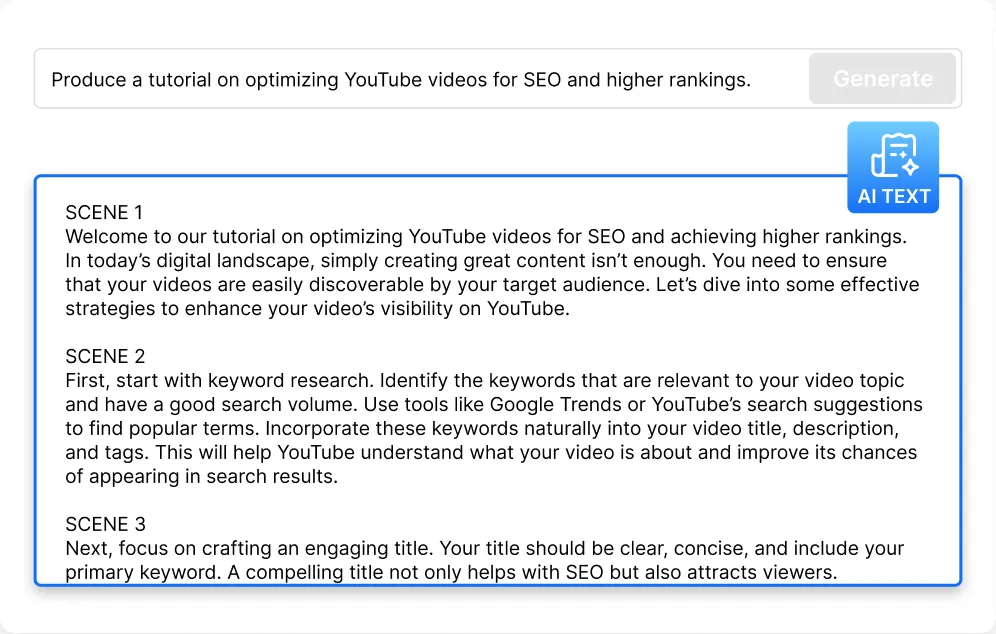 Наш помощник по созданию сценариев искусственного интеллекта может быстро создавать контент, сокращая время производства и помогая эффективно соблюдать сжатые сроки.