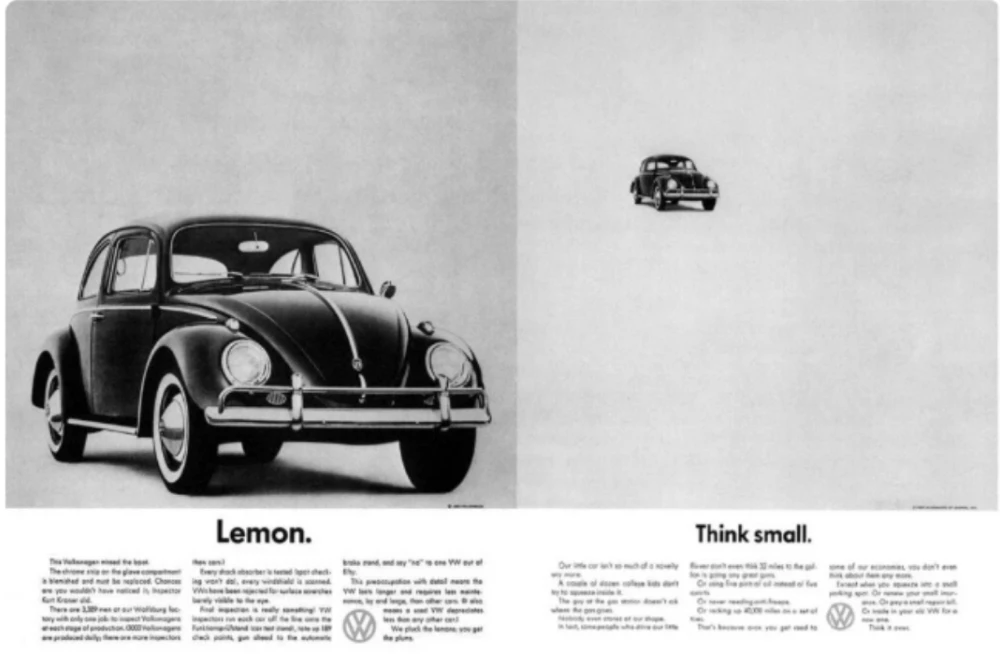 Khi Volkswagen gia nhập thị trường Mỹ vào năm 1949, họ đã phải vật lộn để cạnh tranh với các nhà sản xuất ô tô lớn hơn. Năm 1960, công ty quảng cáo DDB ra mắt “Think Small” chiến dịch. Các quảng cáo đã thách thức ý tưởng rằng “lớn hơn là tốt hơn” và thay vào đó tôn vinh Beetle vì nó nhỏ và giá cả phải chăng.